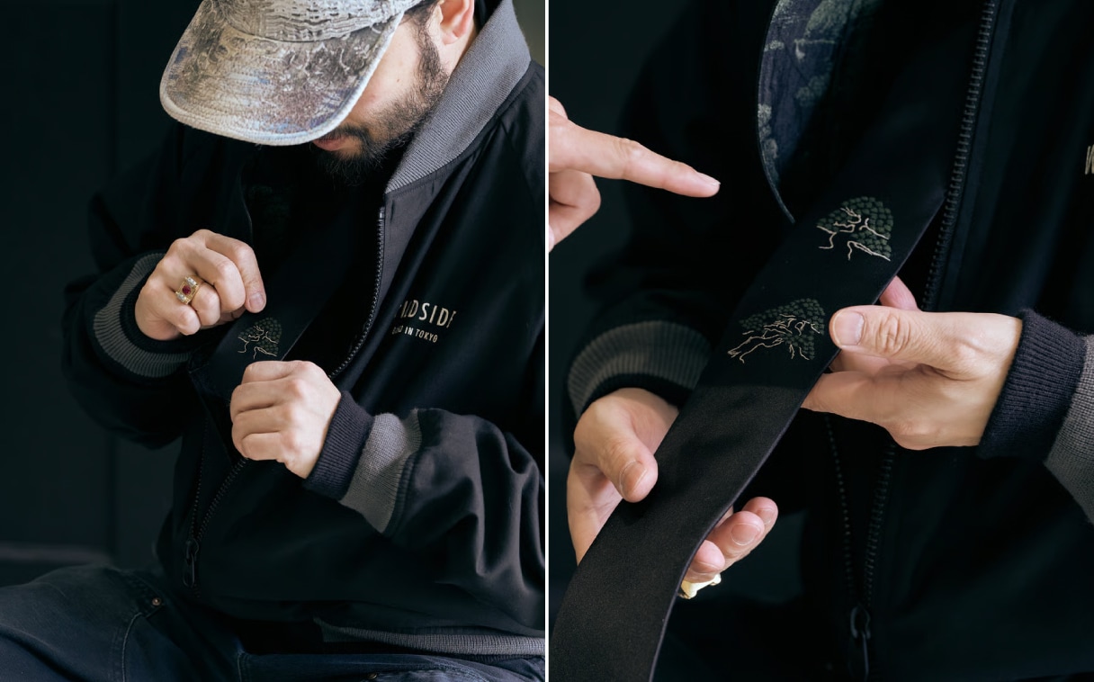 小木:テーラードスタイルを残しつつ、スタッフの皆さんが作業中でも着られるアイテムのイメージをワイルドサイドとトラッドマンズのチームで膨らませていきました。スーベニアジャケット、テーラードジャケット、ドローストリングパンツは、裏地に「501」を総柄のジャガード織り。スーベニアジャケットはリバーシブル仕様で、総柄がパッと見では盆栽と分からないカモ柄のような表情で個人的にも気に入っています。
